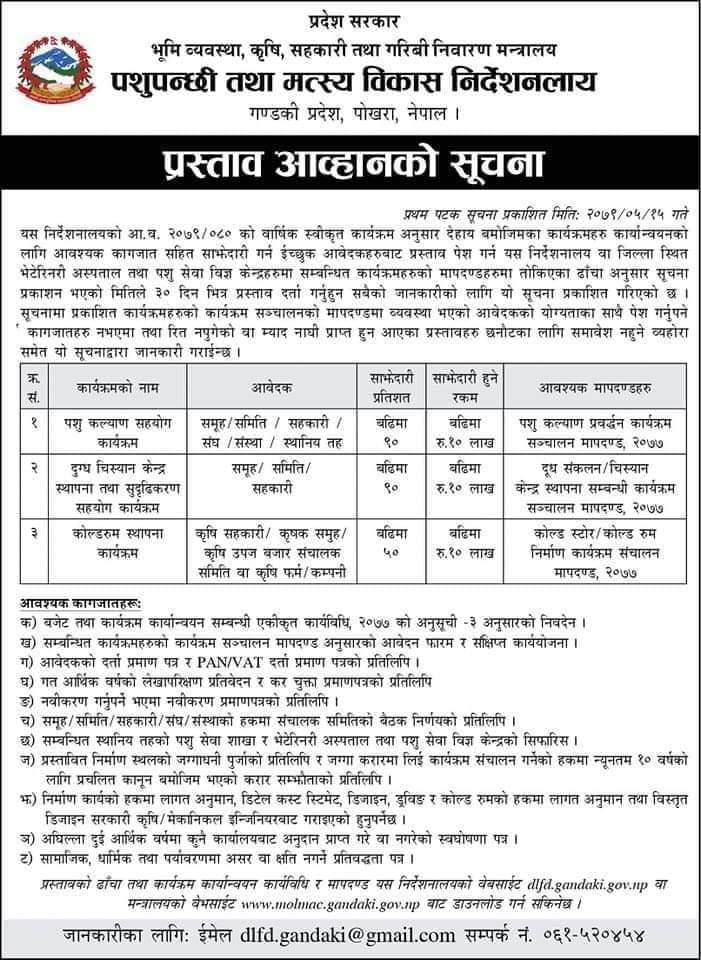 पशुपन्छी तथा मत्स्य विकास निर्देसनालय, गण्डकी प्रदेशको प्रस्ताब आहवानको सूचना