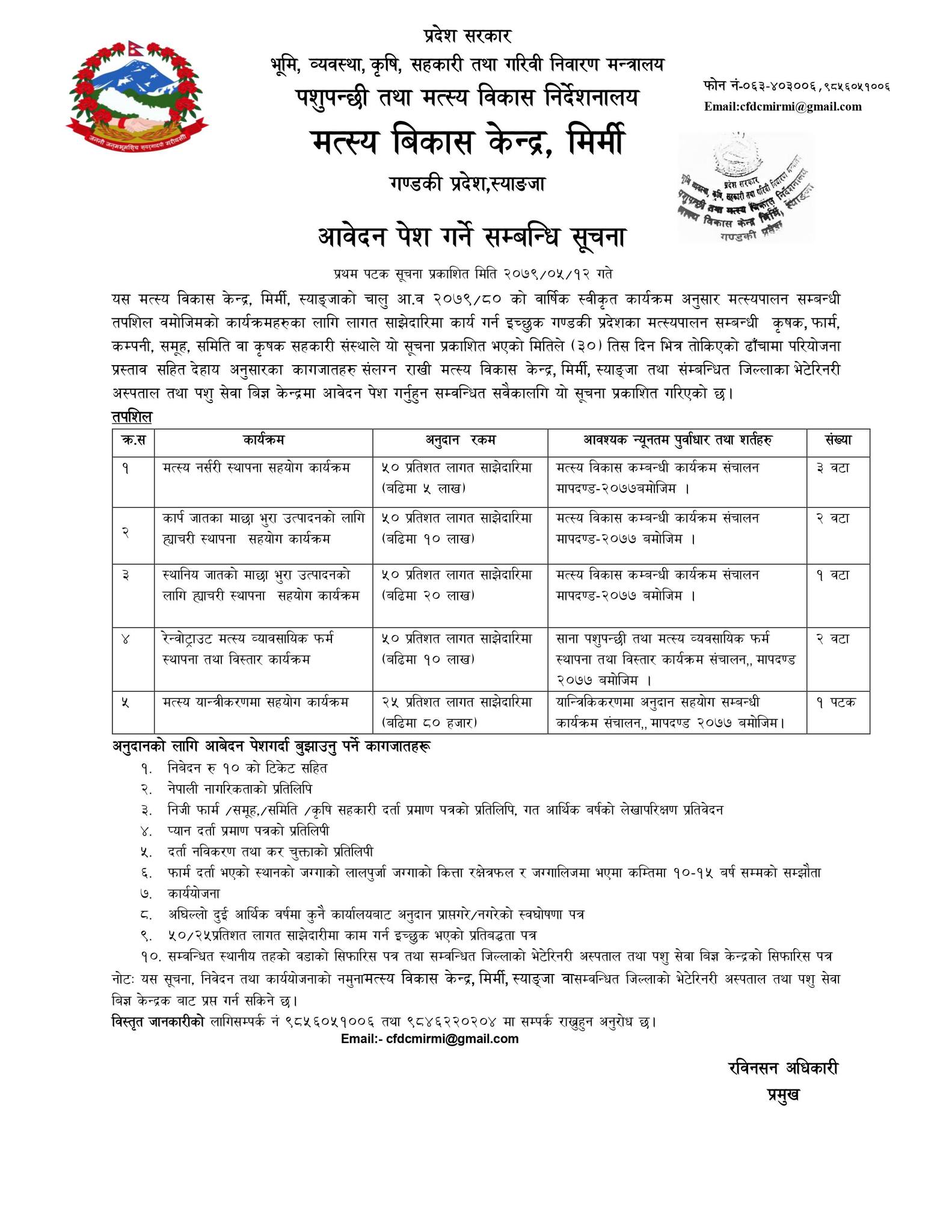 मत्स्य विकास केन्द्र, मिर्मी, स्याङजाको चालु आ.व २०७९/८० को वार्षिक स्वीकृत कार्यक्रम अनुसार मत्स्यपालन सम्बन्धी कार्यक्रम माग समन्धी सूचना